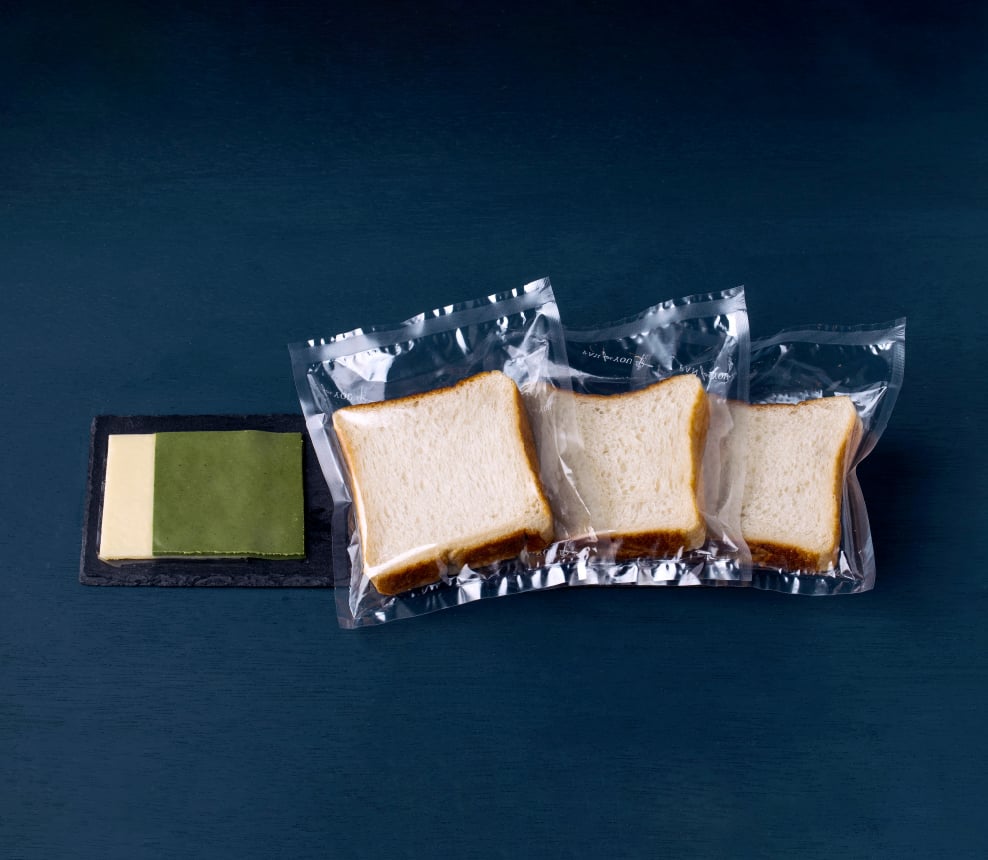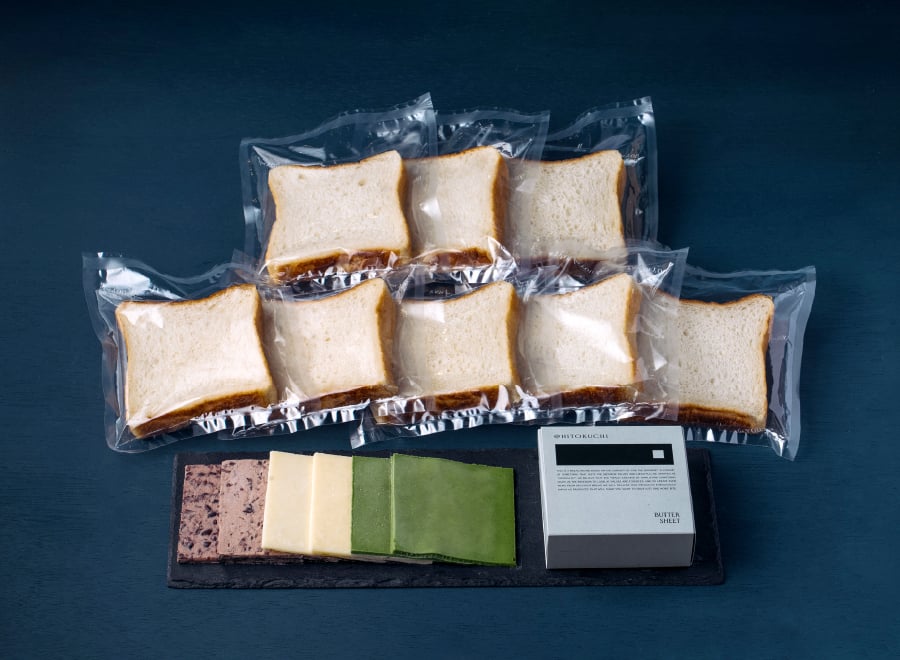 食パン「結」と、百花蜜・抹茶のバターシートを少しずつ。香りや甘み、コクを確かめながら、朝のひとときをゆったりと味わえるセットです。
